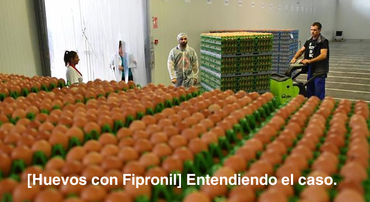 En este caso la presencia de fipronil se detectó en los huevos, llegando a ellos por haber rociado sobre las gallinas para eliminar los ácaros. El producto tiene la capacidad para acumularse en el tejido adiposo, por lo que los restos de esta fumigación pueden llegar a la yema de los huevos. Varios expertos en seguridad alimentaria consultados por el diario “El Mundo” han aclarado que, con la cantidad presente en los huevos detectados, para que el producto suponga un riesgo para la salud sería necesaria una ingesta elevada y prolongada del mismo. El producto tiene su cuestionamiento no por su alta toxicidad sino por su impacto en especies de insectos “no blanco”, por ejemplo, sus efectos sobre las abejas fueron muy nocivos, debido a que son insectos sociales, y llegaban a los colmenares infectadas y/o con el polen contaminado, elimando toda la colonia. Todos los insecticidas utilizados en el control de plagas presentes en cultivos o en animales de cría (tanto mamíferos como aves) antes de ser cosechados o faenados respectivamente, deben respectar un “tiempo de carencia”, necesario parar lograr que los insecticidas en ellos presente se degraden y lleguen a los valores permitidos. Cuando el alimento ya procesado entra a la cadena alimentaria, a estos se los analiza para determinar que ninguna de las sustancias sobrepase los niveles máximos de residuos (LMR). No solamente se determinan estos valores en insecticidas, sino también presencia de hormonas, medicamentos, desinfectantes, etc. Todos ellos también tienen un LMR. Fernando Melgar, Titular de Dapquim, explica: “Antes de realizar una exportación de alimentos, tanto de origen animal como vegetal, los organismos estatales locales determinarán si los valores cumplen con los estándares establecidos para el país de destino. Cada uno de ellos en particular tiene un valor permitido. Si se pasan de ese valor no son aceptados. En este caso del fipronil se detectó por arriba de los valores permitidos. Como se podría haber detectado cualquier otro principio activo.”, afirma.